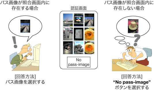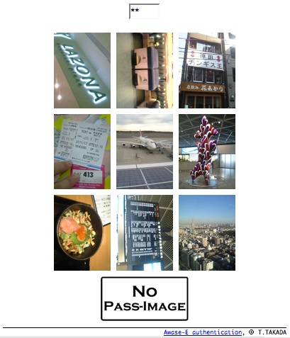 In the system, you must type "awasee" in the form and click OK button. - After a while, a verification screen like below figure appears. A verification screen has nine pictures and "No pass-image" button. If the screen includes your pass-image, you have to select it as a response. If the screen does not include any of your pass-images, you have to push "No pass-image" button.